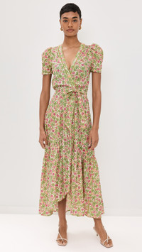 - Fabric: Lightweight, non-stretch jacquard voile - Crochet picot trim - Faux wrap silhouette with curved slit at front - Floral print with swiss dots - Ruffle hem - Surplice neckline - Short puff sleeves - Smocked elastic waist with tie at front - Shell: 85% cotton/15% metallic - Unlined - Hand wash - Imported, Indonesia Style #PBART30473