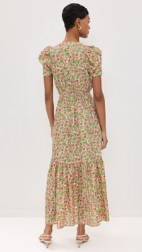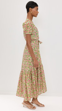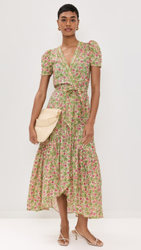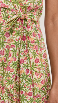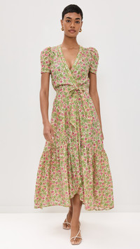 - Fabric: Lightweight, non-stretch jacquard voile - Crochet picot trim - Faux wrap silhouette with curved slit at front - Floral print with swiss dots - Ruffle hem - Surplice neckline - Smocked elastic waist with tie at front - Shell: 85% cotton/15% metallic - Unlined - Hand wash - Imported, Indonesia - Short puff sleeves Style #PBART30473 Size & Fit Model measurements: Size XS: Ariana (5'9") usually wears size XS Measurements from size XS Length: 51.25in / 130.0cm, from shoulder