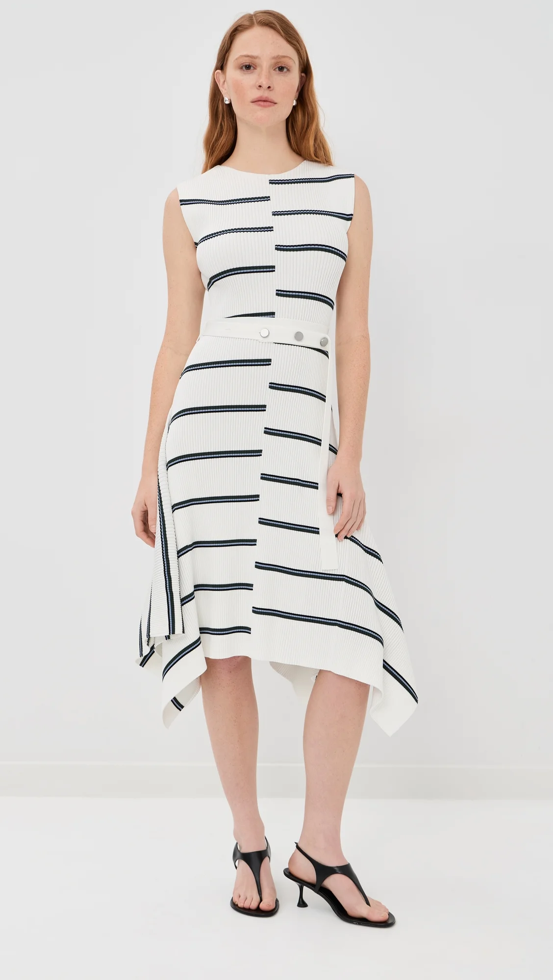 - Fabric: Mid-weight, super-stretch ribbed knit - Stripe pattern - Draped asymmetrical hem - Optional, adjustable belt at waist - Knee length - V neck - Sleeveless - Pullover design, no closure - Shell: 44% acetate/40% viscose/9% polyester/7% polyamide - Unlined - Dry clean - Imported, China Style #PROSH20996 Size & Fit Model measurements: Size S: Haley (5'9.5") usually wears size S Measurements from size XS Length: 39.25in / 100.0cm, from shoulder to front hem