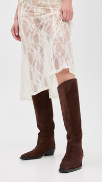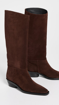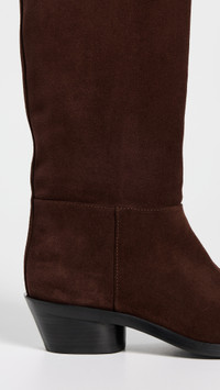 - Upper: Suede - Lining: Leather - Block heel - No closure, pull-on design - Pointed toe - Leather sole with rubber heel cap - Made in Italy - This item cannot be gift-boxed Style #PROSH20898 Size & Fit This shoe is available in whole sizes only. If you wear a half size, please size up. Customers say: Runs small; please size up. Heel: 0in / 3mm Shaft: 15.75in / 40cm Circumference: 14.5in / 37cm