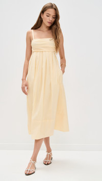 - Fabric: Lightweight, low-stretch technical poplin - Pleated skirt - Ruched bodice with self-tie at back - Double-layered hem - Midi length - Square neckline - Sleeveless - Hook-and-eye and hidden zip at side - On-seam side pockets - Shell: 55% polyamide/41% cotton/4% elastane - Lined - Lining: 100% cotton - Wash cold - Imported, Vietnam Style #PSWLL30518 Size & Fit Designed with a midi-length A-line silhouette. Cotton-blend fabric has a crisp feel and offers stretch. Shopbop’s expert stylist says: Runs true to size Model measurements: Size 0: Margaret (5'11") usually wears size 0 Measurements from size 2 Length: 49.25in / 125.0cm, from shoulder to front hem