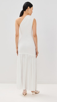 - Fabric: Mid-weight stretch knit - Ruching at waist - Pleated crepe skirt - One-shoulder neckline - Hook-and-eye and hidden zip at side - Shell: 65% viscose/17% polyamide/14% polyester/3% silk/1% elastane - Trim: 100% polyester - Unlined - Dry clean - Imported, China Style #PROSH20837