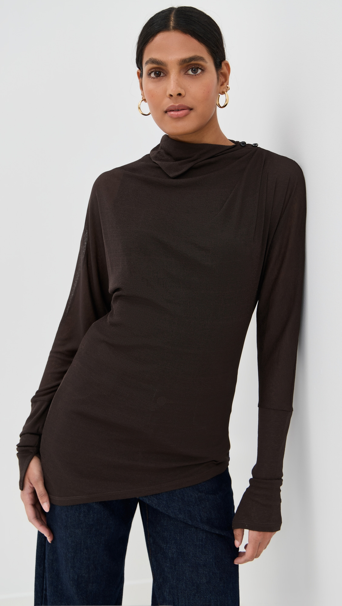 - Fabric: Lightweight stretch jersey - Asymmetrical hem - Split cuffs - Mock neck - Long sleeves - Buttons at shoulder - Shell: 100% polyester - Optional tank lining - Dry clean - Imported, China Style #PROSH20933