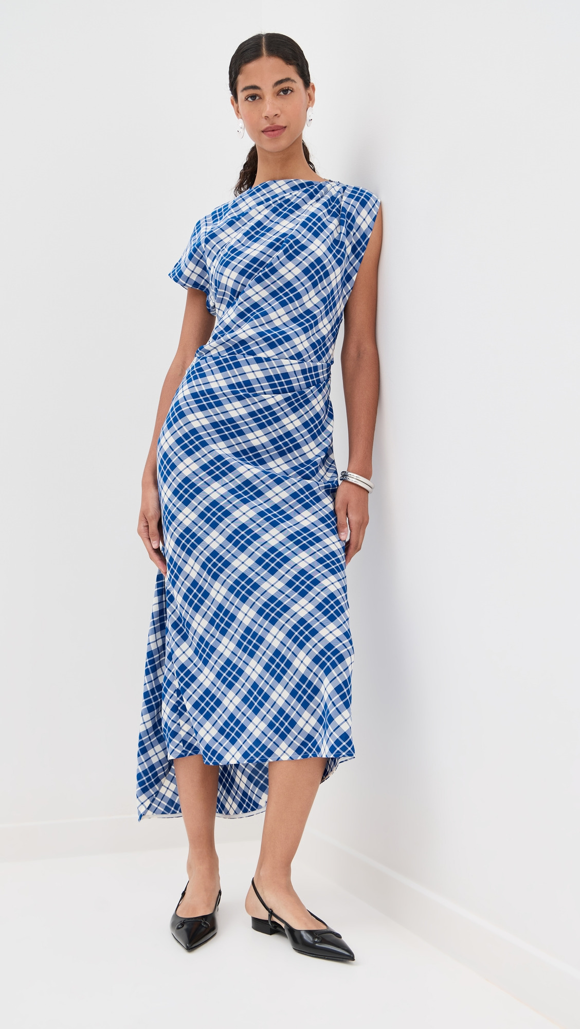 - Fabric: Lightweight, non-stretch crepe - Draped detailing - Asymmetrical hem - Plaid print - Maxi length - Boat neck - Short sleeves - Hook-and-eye and hidden zip at side - Shell: 100% viscose - Unlined - Dry clean - Made in Portugal Style #PROSH20889