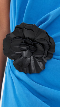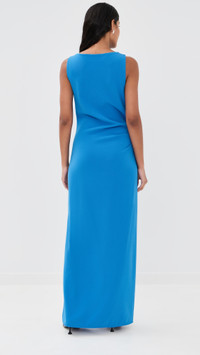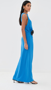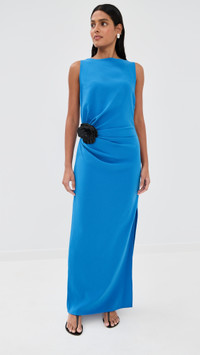 - Fabric: Mid-weight, low-stretch crepe - Ruched side and draped detailing - Removable flower accent - Side slit - Maxi length - Boat neck - Sleeveless - Hook-and-eye and hidden zip at side - Shell: 70% triacetate/30% polyester - Unlined - Dry clean - Imported, China Style #PROSH20947 Size & Fit Model measurements: Size 0: Samruddhi (5'8") usually wears size 0-2 Measurements from size 2 Length: 59.5in / 151.0cm, from shoulder to front hem