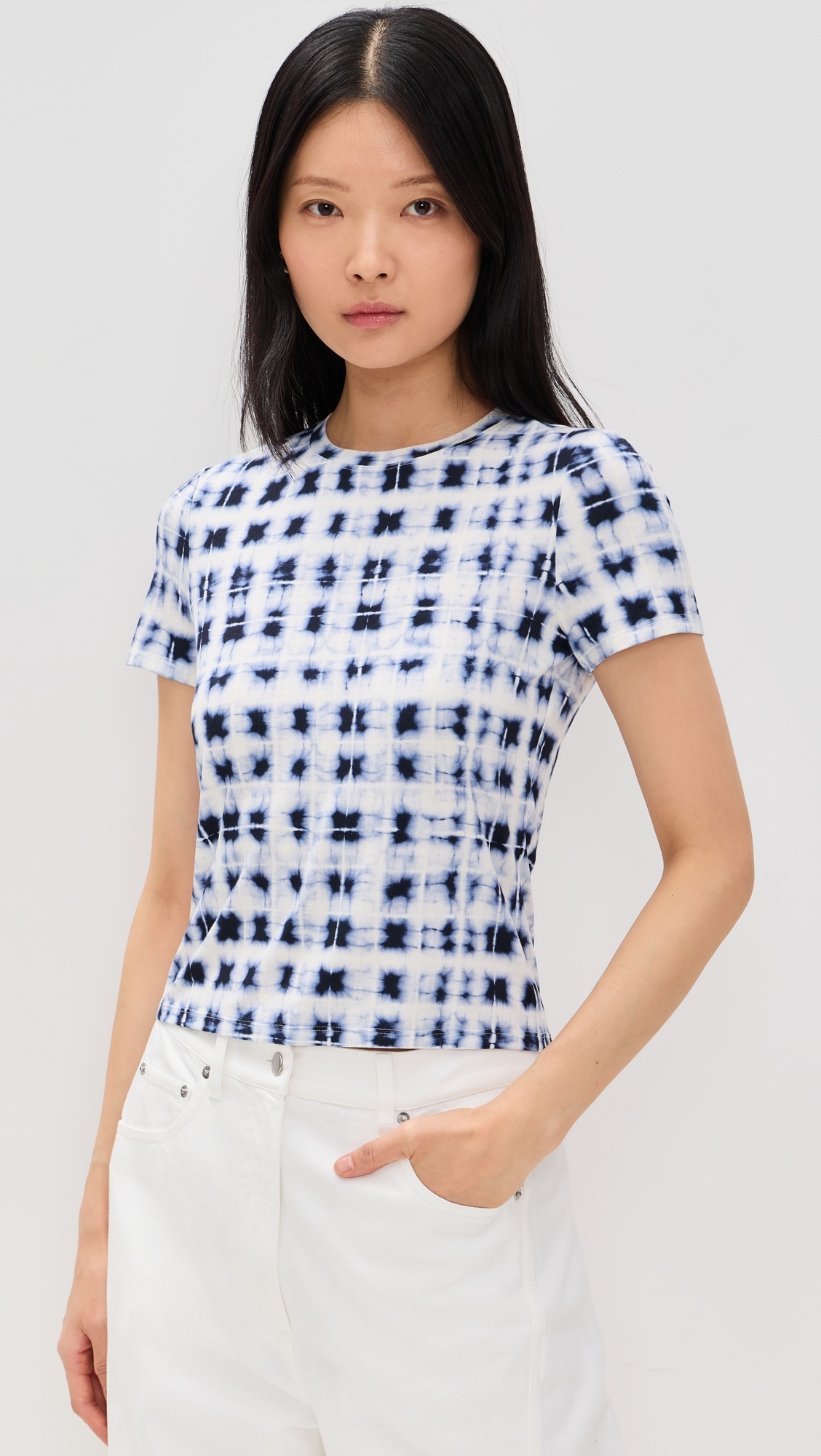 - Fabric: Lightweight slinky jersey - Tie-dye print - Crew neck - Short sleeves - Shell: 93% rayon/7% spandex - Wash cold - Imported, China Style #PSWLL30493