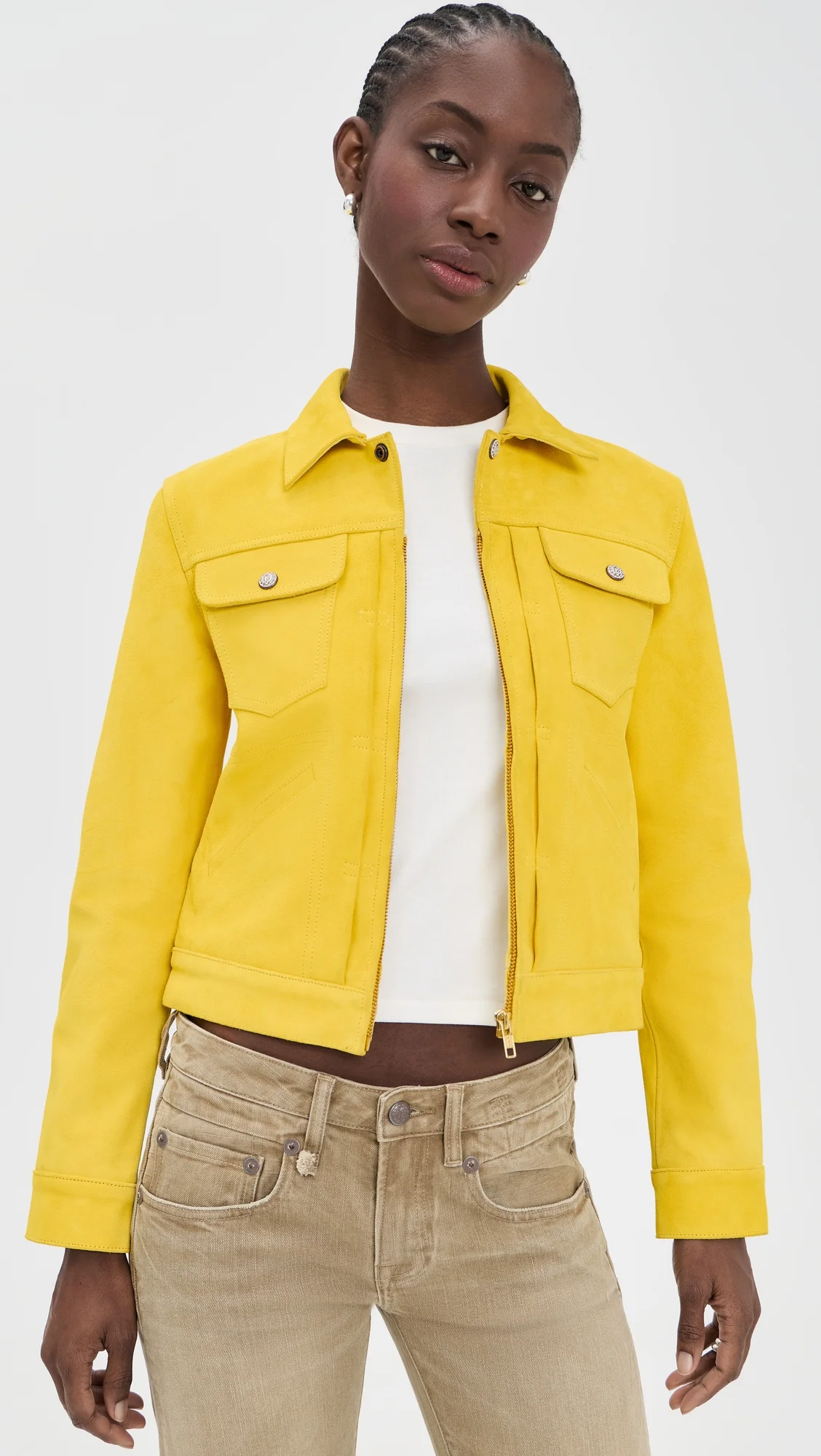 - Fabric: Mid-weight, non-stretch suede - Adjustable button tabs at sides - Collared neck - Long sleeves with snap cuffs - Zip at front - Welt front pockets - Flap breast pockets - Shell: 100% calfskin - Lined - Lining: 100% polyester - Leather clean - Imported, India Style #RTHIR21697 Size & Fit Model measurements: Size XS: Cher (5'11") usually wears size XS Measurements from size XS Length: 18in / 46.0cm, from shoulder