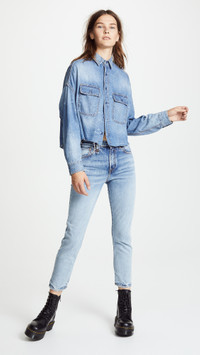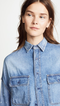- Fabric: Mid-weight, non-stretch denim - Raw hem - Faded wash - Collared neck and button placket - Long sleeves with button cuffs - Flap breast pockets - Shell: 100% cotton - Wash cold - Imported, Turkey Style #RTHIR20613 Size & Fit Customers say: Runs small; please size up. Model measurements: Size S: Magdalena (6'0") Measurements from size S Length: 20in / 51.0cm, from shoulder to back hem