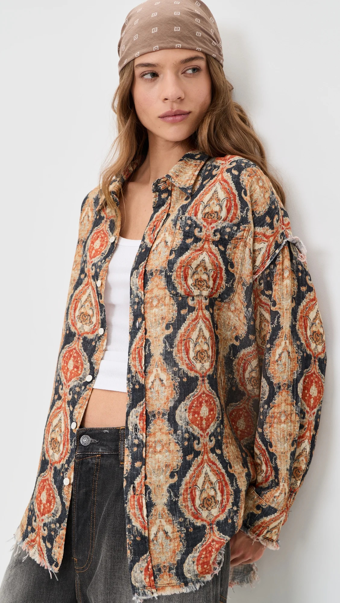 - Fabric: Lightweight, low-stretch weave - Distressed at edges - Abstract print - Collared neck - Long sleeves with button cuffs - Button placket - Patch breast pocket - Shell: 100% cotton - Wash cold - Made in Italy Style #RTHIR21695 Size & Fit Model measurements: Size XS: Margaret (5'11") usually wears size XS Measurements from size XS Length: 30.75in / 78.0cm, from shoulder