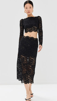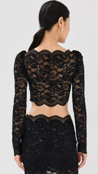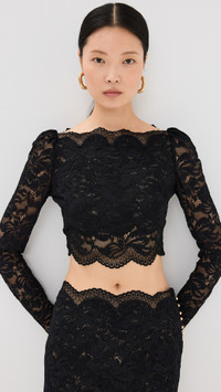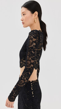 - Fabric: Lightweight, stretch floral lace - Scalloped edges - Cropped length - Boat neck - Semi-sheer - Shell: 90% polyamide/10% elastane - Hand wash - Imported, Tunisia - Long sleeves Style #PACOO30641 Size & Fit Model measurements: Size 36: Somin (5'10.5") usually wears size 32-34 Measurements from size 36 Length: 14.5in / 37.0cm, from shoulder