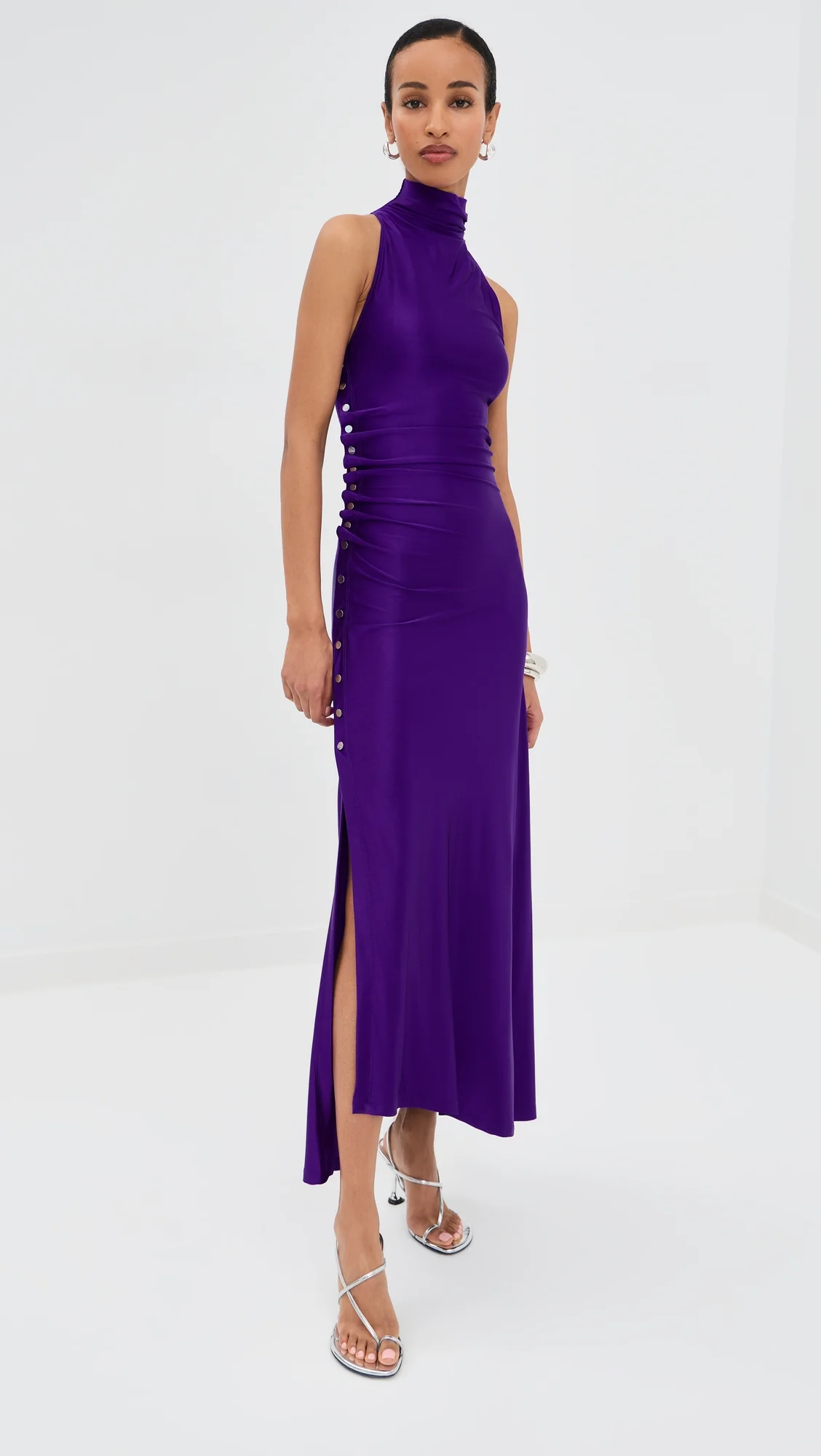 - Fabric: Lightweight, super-stretch fine jersey - Ruched snap placket and split hem at side - Ruched snap closures at neck - Subtle asymmetrical hem - Maxi length - Mock neck - Sleeveless - Shell: 90% viscose/10% elastane - Unlined - Hand wash - Made in Portugal Style #PACOO30845 Size & Fit Model measurements: Size 34: Mical (5'10") usually wears size 32 Measurements from size 34 Length: 56in / 142.0cm, from shoulder to front hem