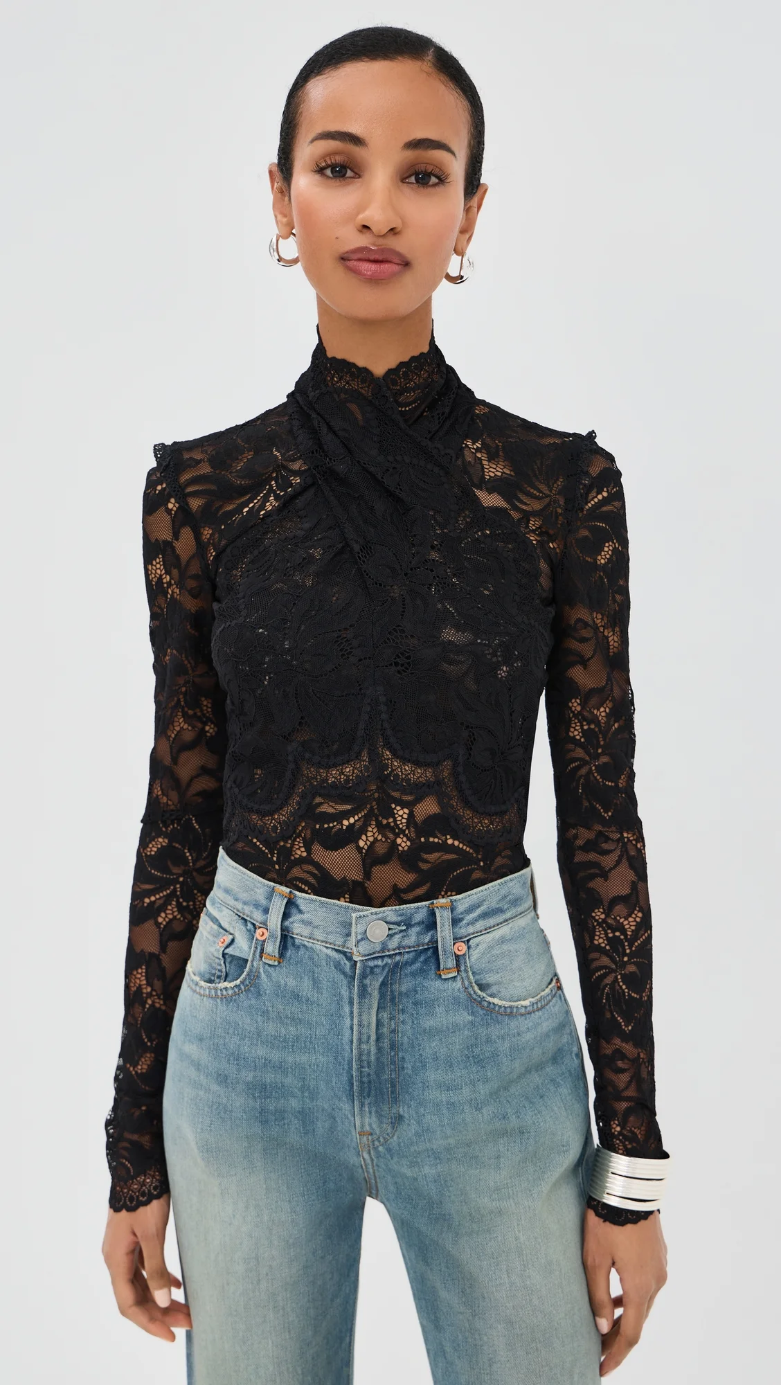 - Fabric: Lightweight, super-stretch lace - Scalloped edges - Twisted detail at neck - Mock neck - Long sleeves - Hidden zip at back - Semi-sheer - Shell: 90% polyamide/10% elastane - Wash cold - Imported, Poland Style #PACOO30836 Size & Fit Model measurements: Size 34: Mical (5'10") usually wears size 32 Measurements from size 36 Length: 23.5in / 60.0cm, from shoulder