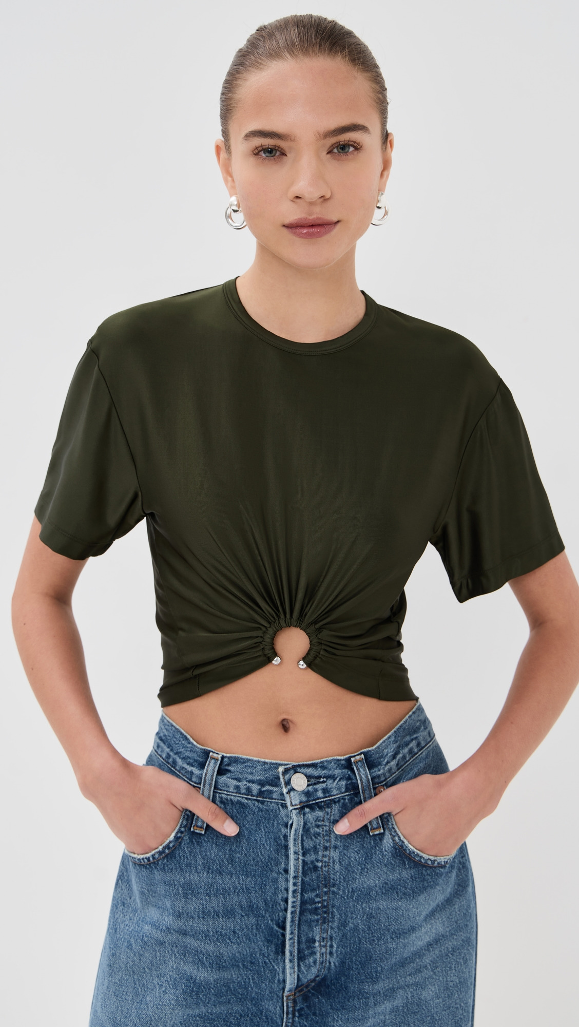 - Fabric: Lightweight slinky jersey - Ruched detailing with ring accent - Crew neck - Short sleeves - Shell: 90% viscose/10% elastane - Dry clean - Made in Portugal Style #PACOO30769 Size & Fit Model measurements: Size 34: Margaret (5'11") usually wears size 32 Measurements from size 36 Length: 15.25in / 39.0cm, from shoulder to front hem Length: 21.25in / 54.0cm, from shoulder to back hem
