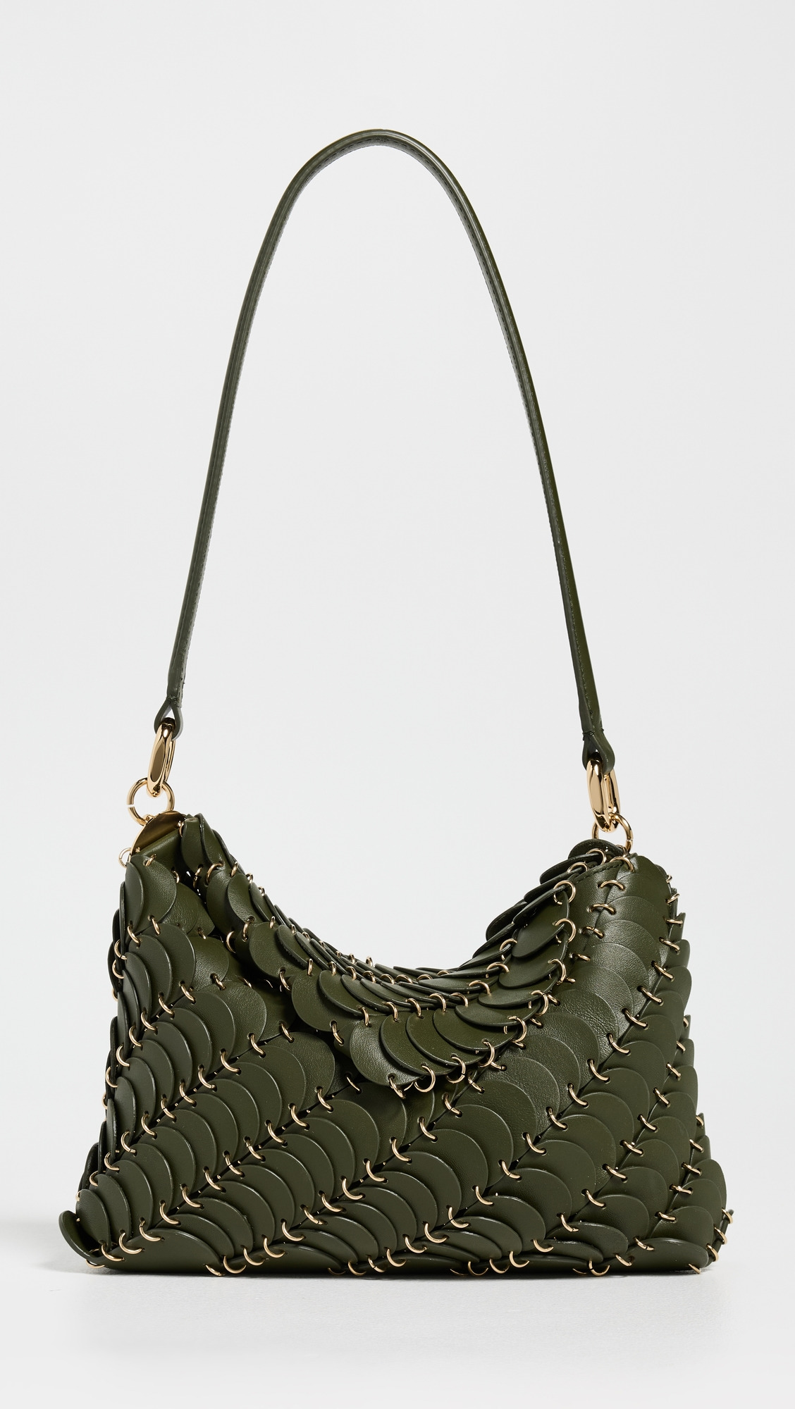 - Cowhide - Leather discs with gold-tone chain connectors - Fold-over flap with magnetic closure - Shoulder strap - Lining: Textile - Weight: 19oz / 0.54kg - Imported, Hungary Style #PACOO30801