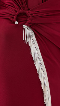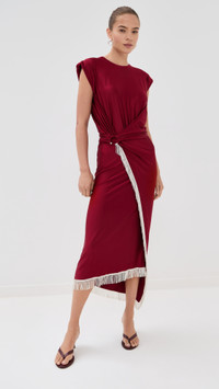 - Fabric: Mid-weight, super-stretch slinky jersey - Draped detailing and silver-tone ring at waist - Fringe edges - Midi length - Crew neck - Short cap sleeves - Pullover design, no closure - Shell: 90% viscose/10% elastane - Unlined - Dry clean - Made in Portugal Style #PACOO30779 Size & Fit Model measurements: Size 34: Margaret (5'11") usually wears size 32 Measurements from size 36 Length: 58.25in / 148.0cm, from shoulder
