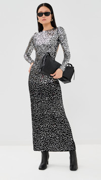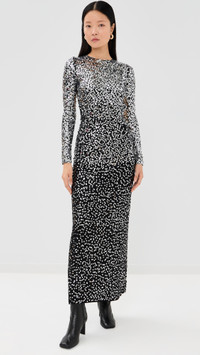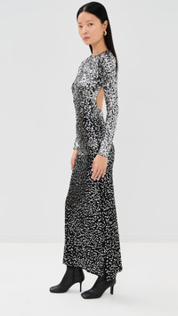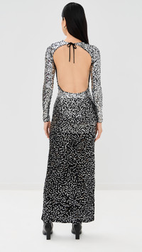 - Fabric: Lightweight, low-stretch jersey - Allover sequins - Open back - Maxi length - Crew neck - Long sleeves - Tie at neckline - Shell: 90% cupro/10% elastane - Partially lined - Lining: 90% polyamide/10% elastane - Hand wash - Made in Portugal Style #PACOO30811 Size & Fit Model measurements: Size 34: Somin (5'10.5") usually wears size 32-34 Measurements from size 34 Length: 59in / 150.0cm, from shoulder to front hem