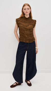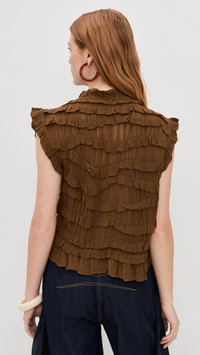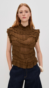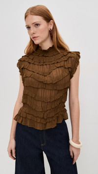 - Fabric: Lightweight stretch crepe - Pleated detailing - Allover ruffles - Mock neck - Short cap sleeves - Semi-sheer - Shell: 100% viscose - Dry clean - Imported, India Style #RACHC21889 Size & Fit Model measurements: Size S: Haley (5'9.5") usually wears size S Measurements from size S Length: 19.75in / 50.0cm, from shoulder