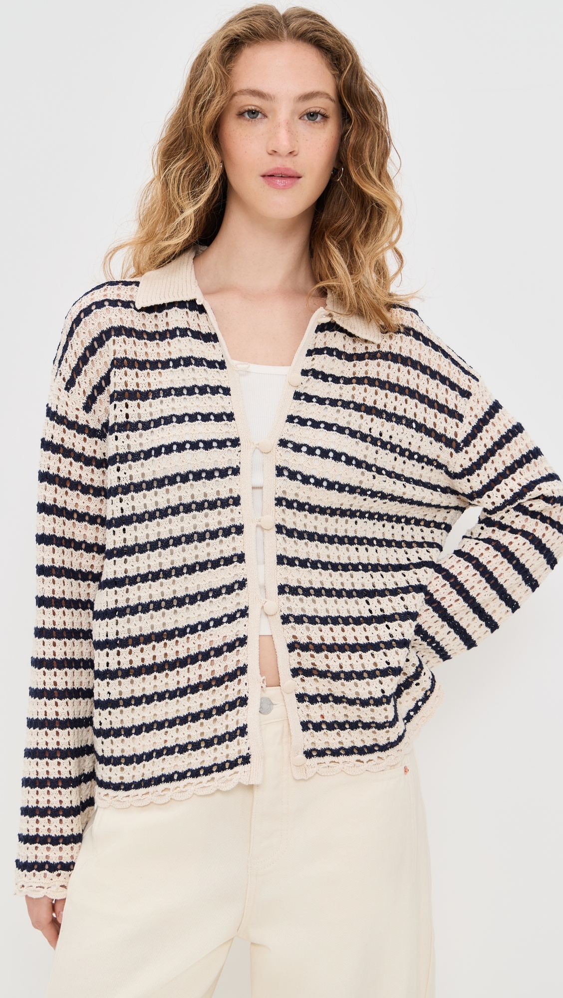 - Fabric: Lightweight open knit - Striped pattern - Scalloped edges - Collared neck - Button placket - Shell: 76% cotton/24% flax - Wash cold - Imported, China - Long sleeves Style #RAGBO47734
