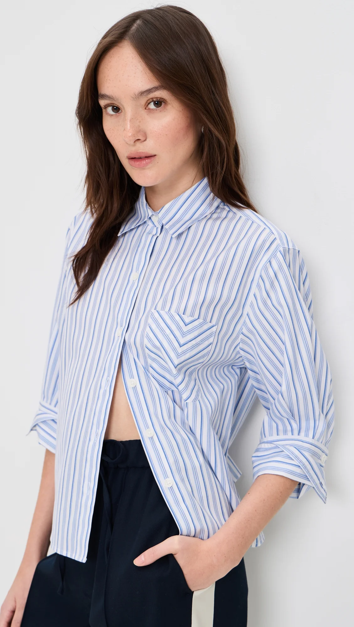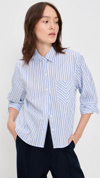 - Fabric: Lightweight, non-stretch poplin - Stripe print - Collared neck - Long sleeves with button cuffs - Button placket - Patch breast pocket - Shell: 100% cotton - Wash warm - Imported, Vietnam Style #RAGBO48234 Size & Fit Model measurements: Size XS: Siobhan (5'5.5") usually wears size XXS Measurements from size S Length: 21.25in / 54.0cm, from shoulder