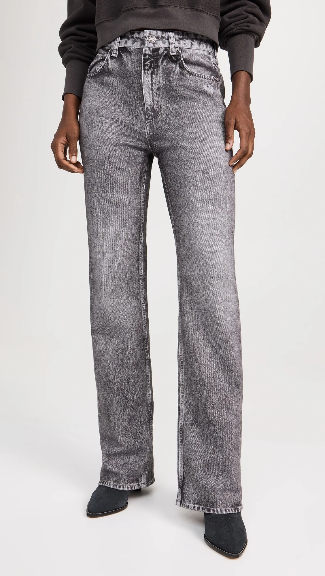 - Fabric: Lightweight french terry with stretch - Made from a sweatpants-style knit fabric with a denim-like print - Denim print - Button closure and zip fly - 5-pocket styling - Shell: 100% cotton - Wash cold - Imported, China Style #RAGBO47472 Size & Fit Features a high rise and a straight-leg cut. French terry is printed to look like denim but has a more comfortable feel, similar to that of sweatpants. Shopbop’s expert stylist says: Runs large; please size down Customers say: Runs large; please size down. Model measurements: Size 24: Cher (5'11") usually wears size 24-25 Measurements from size 26 Rise: 11.75in / 30cm Inseam: 32.25in / 82cm Leg opening: 19in / 48cm
