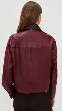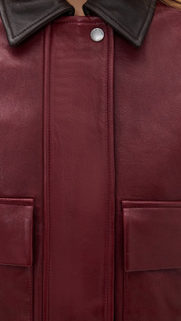 - Fabric: Heavyweight, non-stretch lambskin - Collared neck - Long sleeves - Snap flap and hidden zip placket - Flap front pockets - Shell: 100% leather - Lined - Lining: 100% polyester - Leather clean - Imported, India Style #RAGBO47920 Size & Fit Model measurements: Size XS: Margaret (5'11") usually wears size XS Measurements from size XS Length: 21.75in / 55.0cm, from shoulder