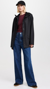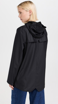- Fabric: Lightweight, non-stretch coated technical weave - Water and wind-resistant - Concealed back vents and underarm eyelets - Long sleeves with snap cuffs - Drawstring hood, rain shield back - Fishtail hem - Snap closure - Flap front pockets - Shell: 100% polyester - Wash cold - Imported, China Style #RAINS30065