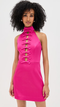- Fabric: Heavyweight stretch satin - Cutout at chest with bow accents - Mini length - Halter neckline - Sleeveless - Hook-and-eye and hidden zip at back - Shell: 57% polyester/43% acetate - Lined - Lining: 97% polyester/3% elastane - Dry clean - Imported, China Style #RVALL30171 Size & Fit Customers say: Runs small; please size up. Model measurements: Size 4: Mical (5'10") usually wears size 4 Measurements from size 4 Length: 31.5in / 80.0cm, from shoulder
