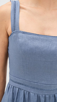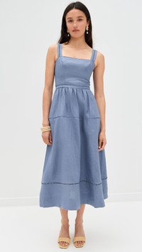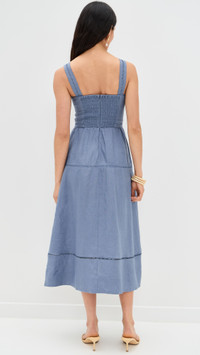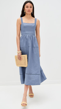 - Fabric: Mid-weight, non-stretch linen weave - Reformation is part of The Climate Pledge, a commitment to reaching net-zero carbon emissions by 2040 - Produced via carbon-neutral manufacturing - Ladder stitch trim - Smocked elastic back panel - Midi length - Square neckline - Hook-and-eye and hidden zip at back - On-seam side pockets - Shell: 100% linen - Lined bodice, unlined skirt - Lining: 100% rayon - Wash cold - Imported, China - Adjustable shoulder straps Style #REFOR41945 Size & Fit Model measurements: Size 0: Isabella (5'9") usually wears size 0 Measurements from size 0 Length: 46.75in / 119.0cm, from shoulder