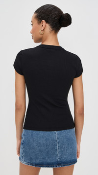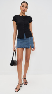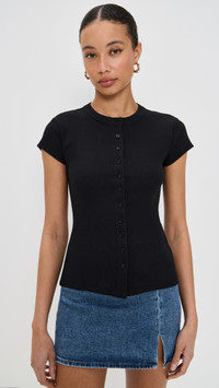- Fabric: Lightweight ribbed jersey with stretch - Reformation is part of The Climate Pledge, a commitment to reaching net-zero carbon emissions by 2040 - Produced via carbon-neutral manufacturing - Crew neck - Button placket - Shell: 97% cotton/3% spandex - Wash cold - Made in the USA - Short sleeves Style #REFOR41919 Size & Fit Customers say: Runs small; please size up. Model measurements: - Size S: Drew (5'8") usually wears size XS-S - Size S: Eyshila (5'10") usually wears size XS Measurements from size XS Length: 22in / 56.0cm, from shoulder