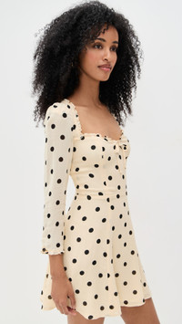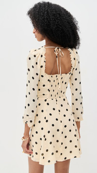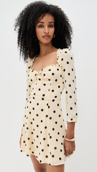 - Fabric: Lightweight, non-stretch georgette - Reformation is part of The Climate Pledge, a commitment to reaching net-zero carbon emissions by 2040 - Polka dot pattern - Ruffled trim - Smocked elastic panel and tie at back - Decorative bow at front - Mini length - Sweetheart neckline - 3/4 sleeves - Hook-and-eye and hidden zip at back - Shell: 100% viscose - Lined - Dry clean - Made in the USA Style #REFOR42193 Size & Fit Model measurements: Size 0: Mical (5'10") usually wears size 0 Measurements from size 0 Length: 30.75in / 78.0cm, from shoulder