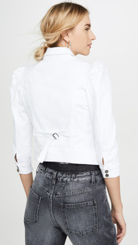 - Fabric: Mid-weight, low-stretch denim - Padded shoulders - Distressed - Adjustable tab at back - Waist-length style - Collared neck - Button placket - Flap breast pockets and welt front pockets - Shell: 98% cotton/2% elastane - Wash cold - Made in Italy - 3/4 puff sleeves with button cuffs Style #RFETE30082 Size & Fit Runs small, please size up. Customers say: Runs small; please size up. Model measurements: Size XS: Anabela (5'9.5") Measurements from size XS Length: 19.25in / 49.0cm, from shoulder