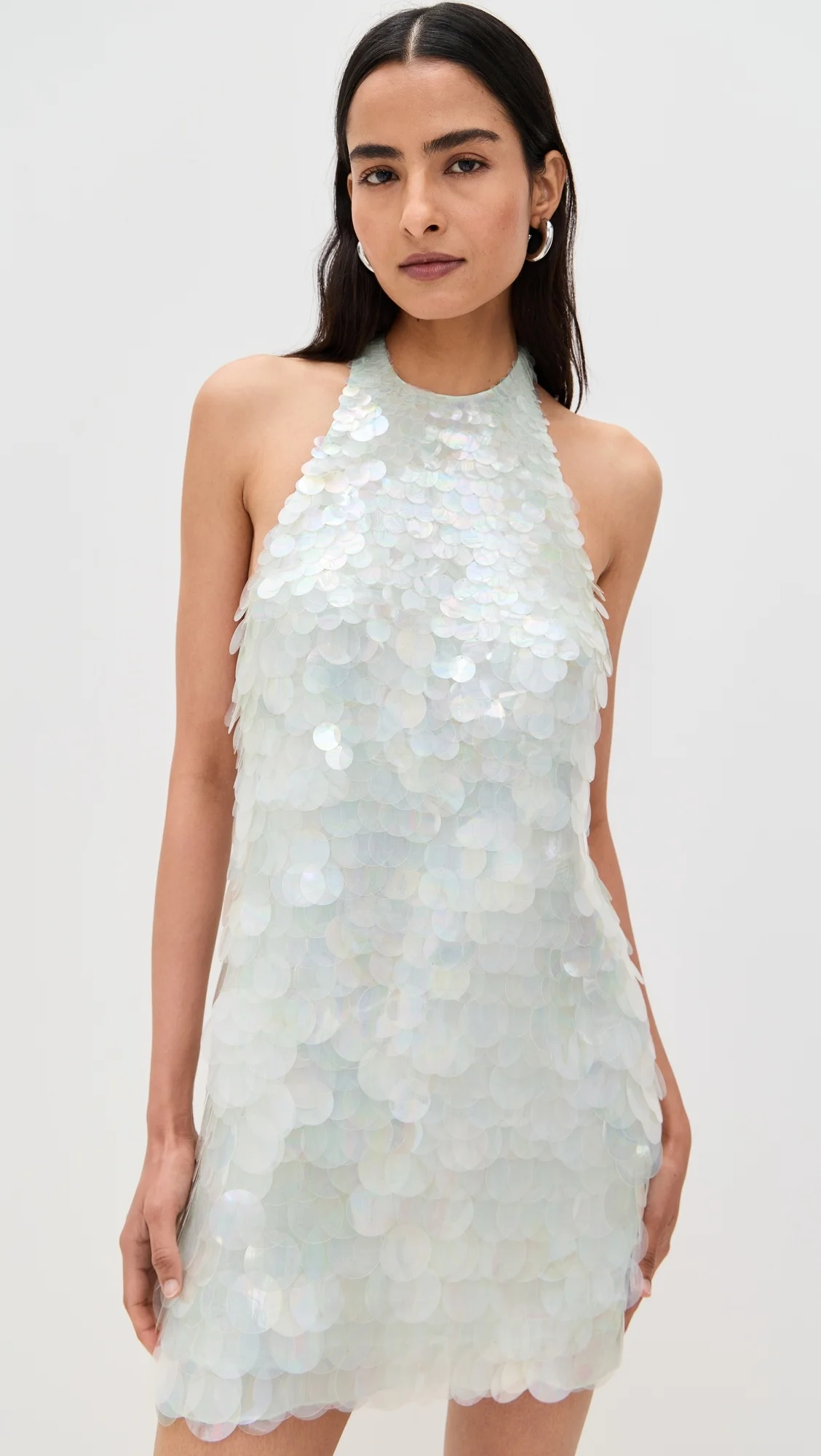 - Fabric: Mid-weight, non-stretch sequined weave - Scooped back - Mini length - Halter neckline - Sleeveless - Hook-and-eye and hidden zip at back - Shell: 100% viscose - Lined - Lining: 100% viscose - Dry clean - Imported, India Style #RFETE30509