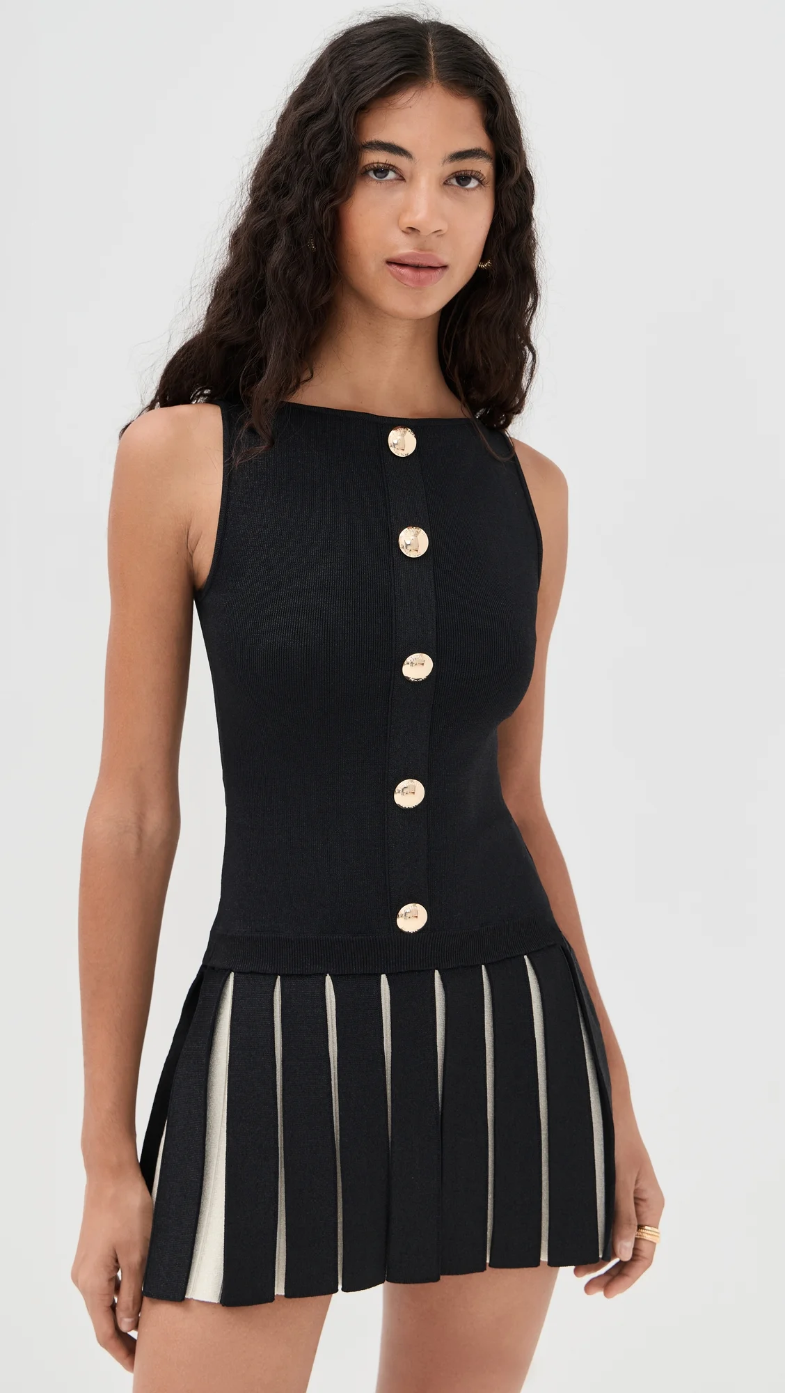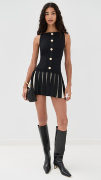 - Fabric: Mid-weight, stretch metallic knit - Gold-tone buttons at front - Mini length - Square neckline - Sleeveless - Hook-and-eye and hidden zip at back - Shell: 60% rayon/32% nylon/5% metallic/3% spandex - Unlined - Hand wash - Imported, China Style #RFETE30532