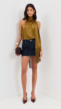 - Fabric: Lightweight, non-stretch satin - Tie at neckline with fringe trim - Mock neck - Sleeveless - Button keyhole at back - Shell: 73% acetate/27% polyester - Trim: 100% polyester - Dry clean - Imported, China Style #RFETE30526 Size & Fit Model measurements: Size XS: Brittany (5'9.5") usually wears size XS Measurements from size XS Length: 21.75in / 55.0cm, from shoulder