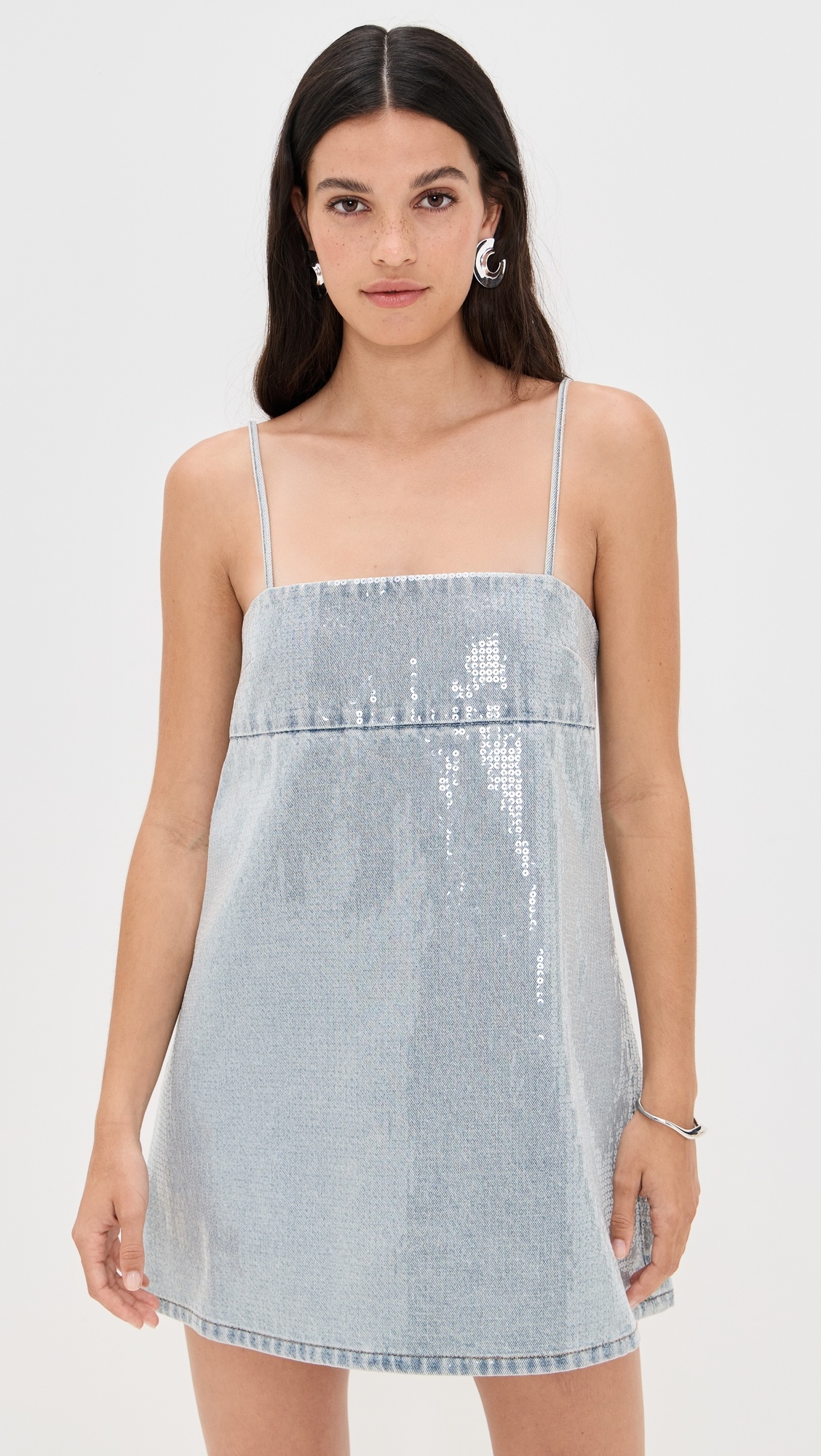 - Fabric: Lightweight, non-stretch denim - Allover sequin embellishments - Mini length - Square neckline - Hook-and-eye and hidden zip at back - Shell: 100% cotton - Lined - Lining: 100% cotton - Dry clean - Imported, China Style #RFETE30507
