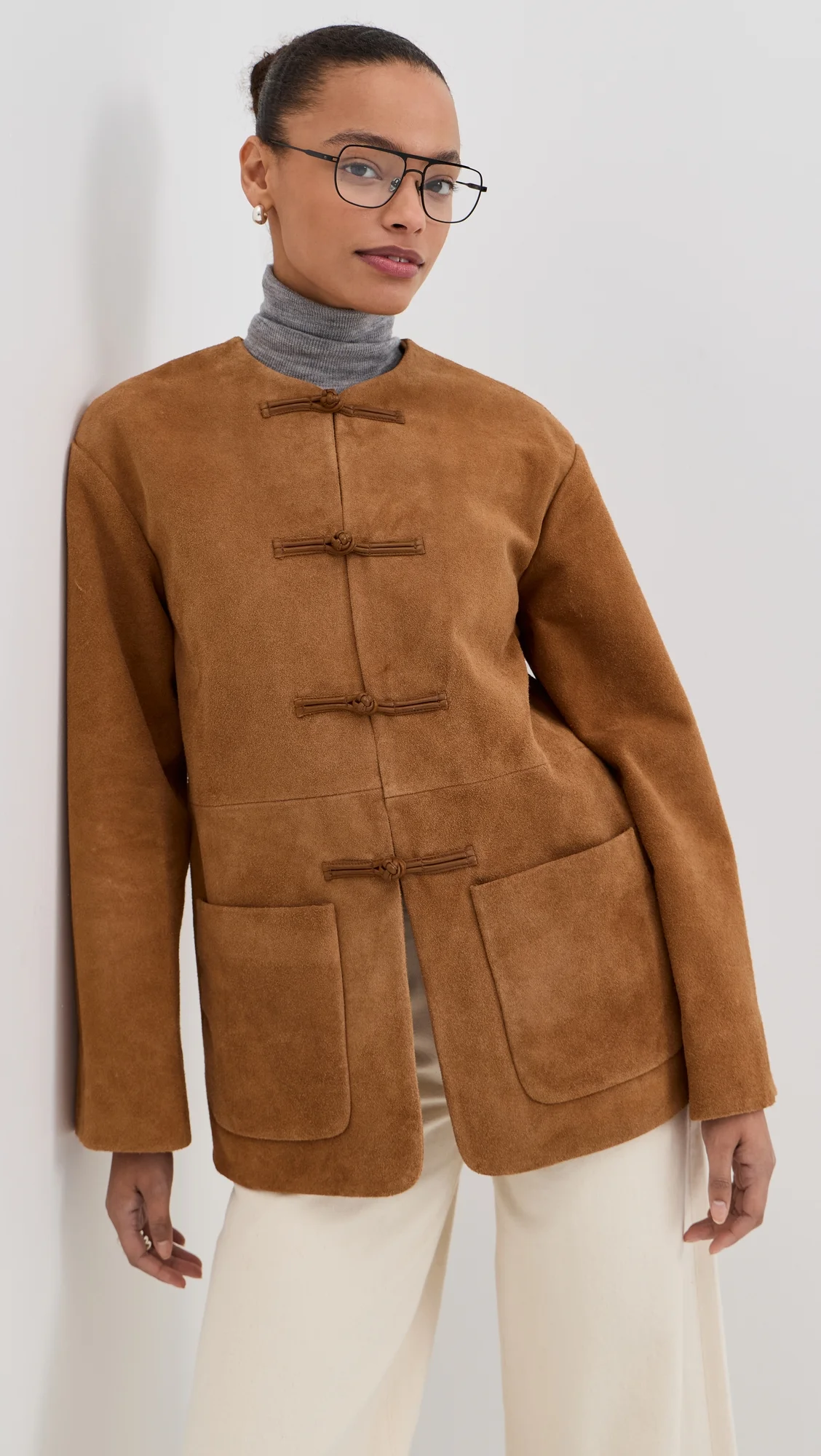 - Fabric: Heavyweight, non-stretch suede - Crew neck - Long sleeves - Pankou knot closures - Patch front pockets - Shell: 100% leather - Lined - Lining: 100% viscose - Leather clean - Imported, India Style #ROHEF30152 Size & Fit Model measurements: Size 34: Alexis (5'8") usually wears size 32-34 Measurements from size 34 Length: 28in / 71.0cm, from shoulder
