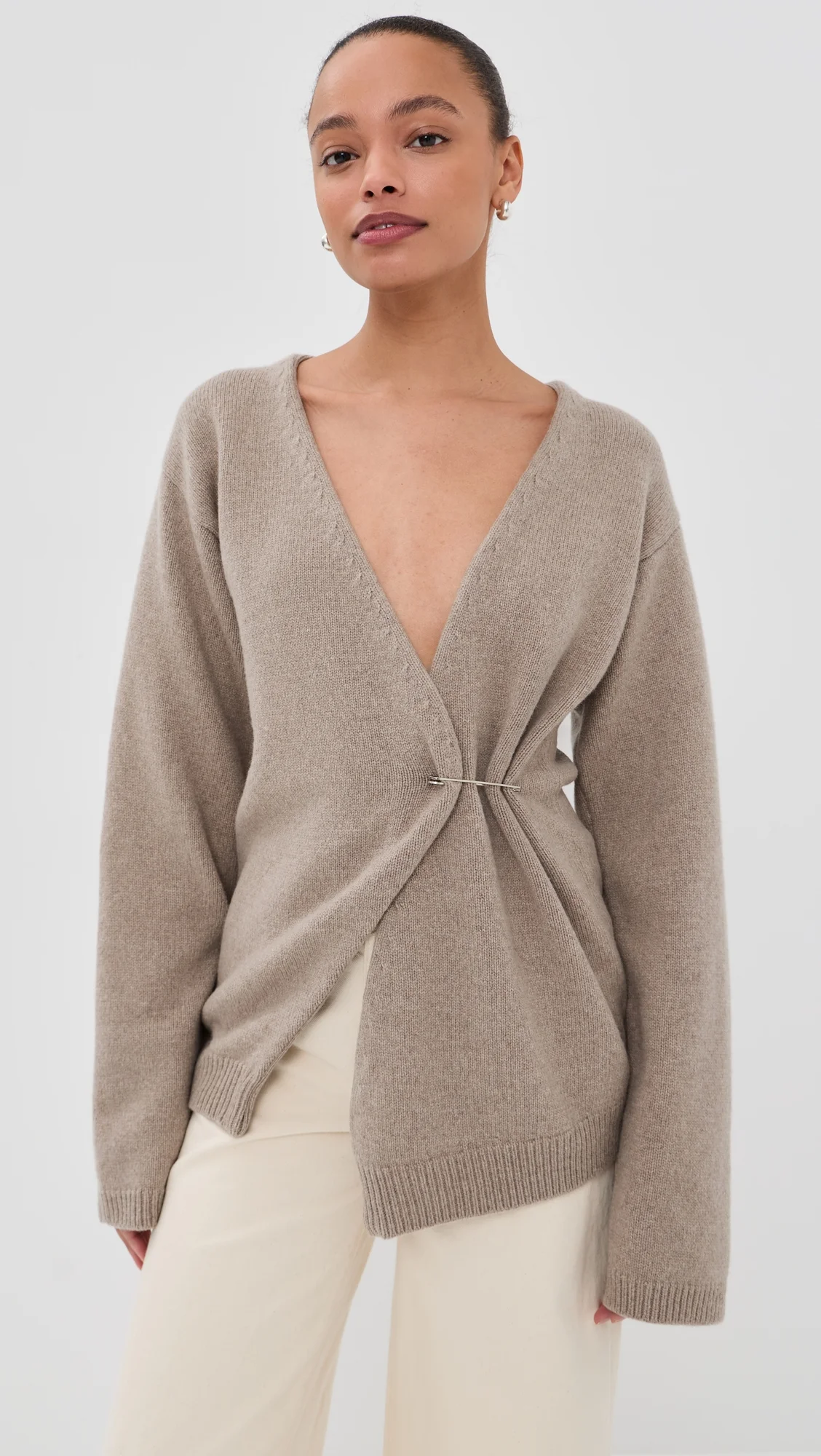 - Fabric: Mid-weight, low-stretch knit - Silver-toned safety pin closure - Rib knit trim - V neck - Long sleeves - Shell: 70% wool/30% cashmere - Dry clean - Made in Italy Style #ROHEF30161