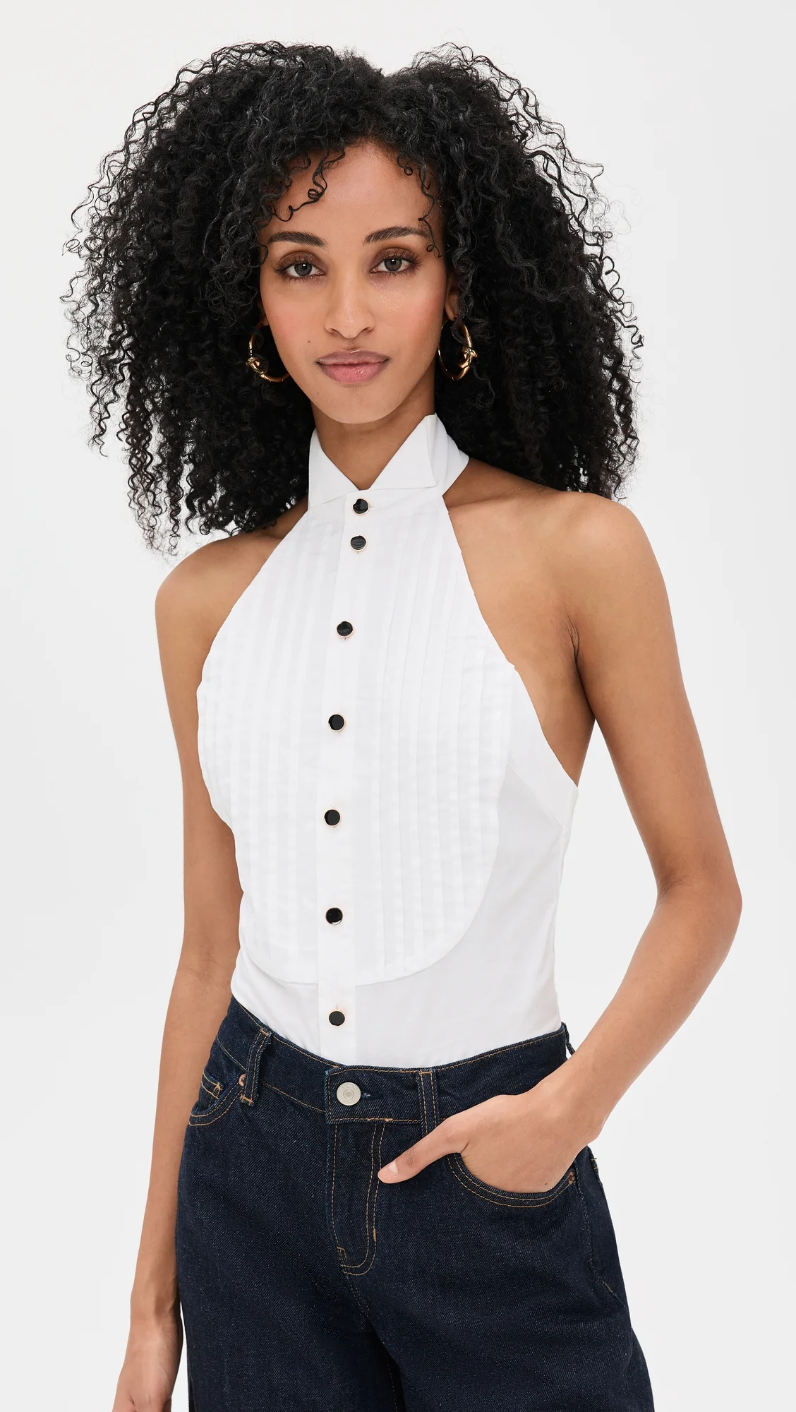 - Fabric: Lightweight, low-stretch poplin - Tuxedo pleating at bodice - Open back - Contrast buttons - Halter neckline - Sleeveless - Thong back and snap gusset - Button placket - Hidden zip at back - Shell: 100% cotton - Partially lined - Lining: 90% polyester/10% spandex - Wash cold - Imported, China Style #RONNY45484