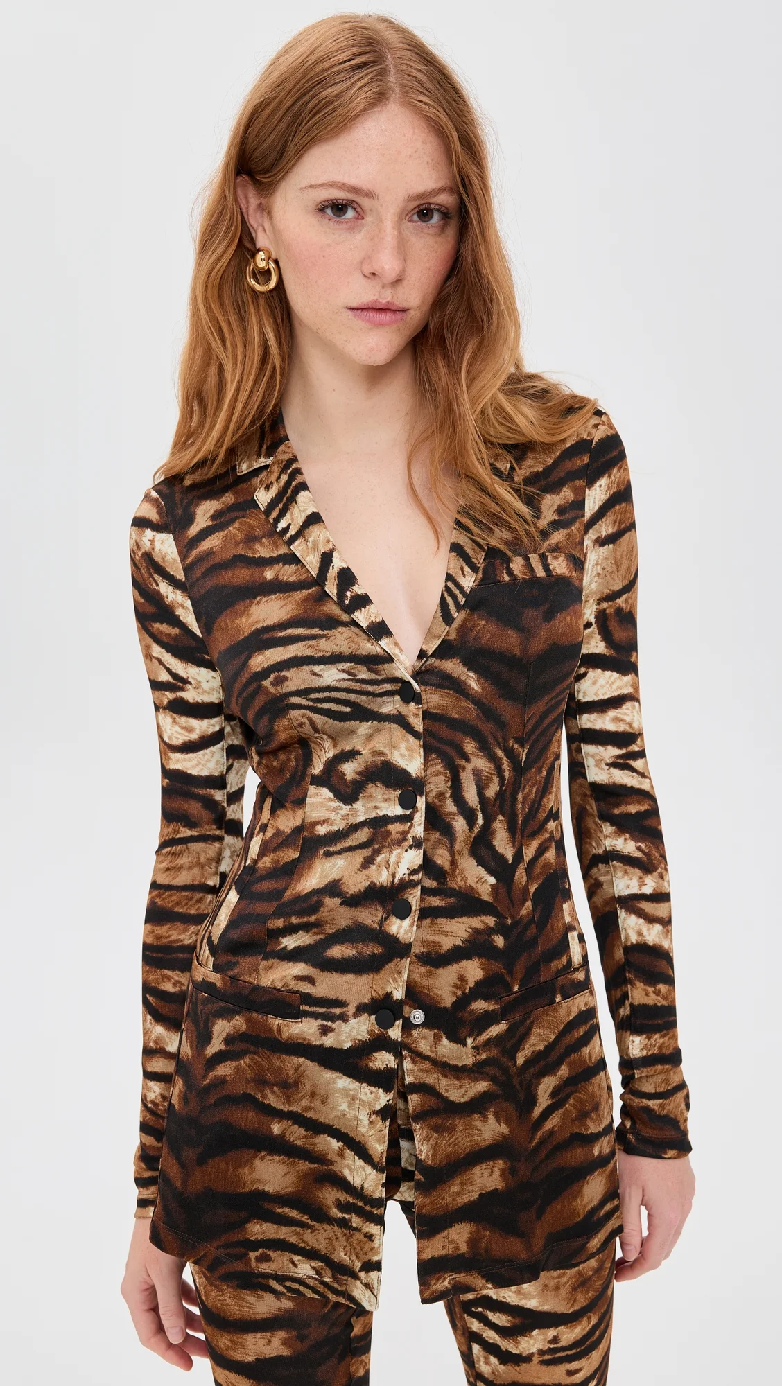- Fabric: Mid-weight slinky jersey with stretch - Tiger stripe print - Collared neck - Long sleeves with snap cuffs - Snap placket - Faux front pocket - Shell: 100% viscose - Dry clean - Imported, China Style #RONNY45474 Size & Fit Model measurements: Size S: Haley (5'9.5") usually wears size S Measurements from size S Length: 26.75in / 68.0cm, from shoulder