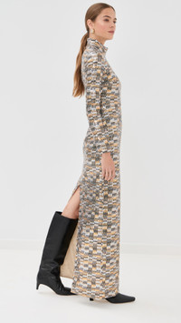 - Fabric: Mid-weight sequined mesh with stretch - Back slit - Maxi length - Turtleneck - Long sleeves - Hidden zip at back - Shell: 95% polyester/5% elastane - Lined - Lining: 65% viscose/25% polyamide/10% elastane - Dry clean - Made in the USA Style #RGETT30256 Size & Fit Model measurements: Size 0: Margaret (5'11") usually wears size 0 Measurements from size 0 Length: 57.5in / 146.0cm, from shoulder