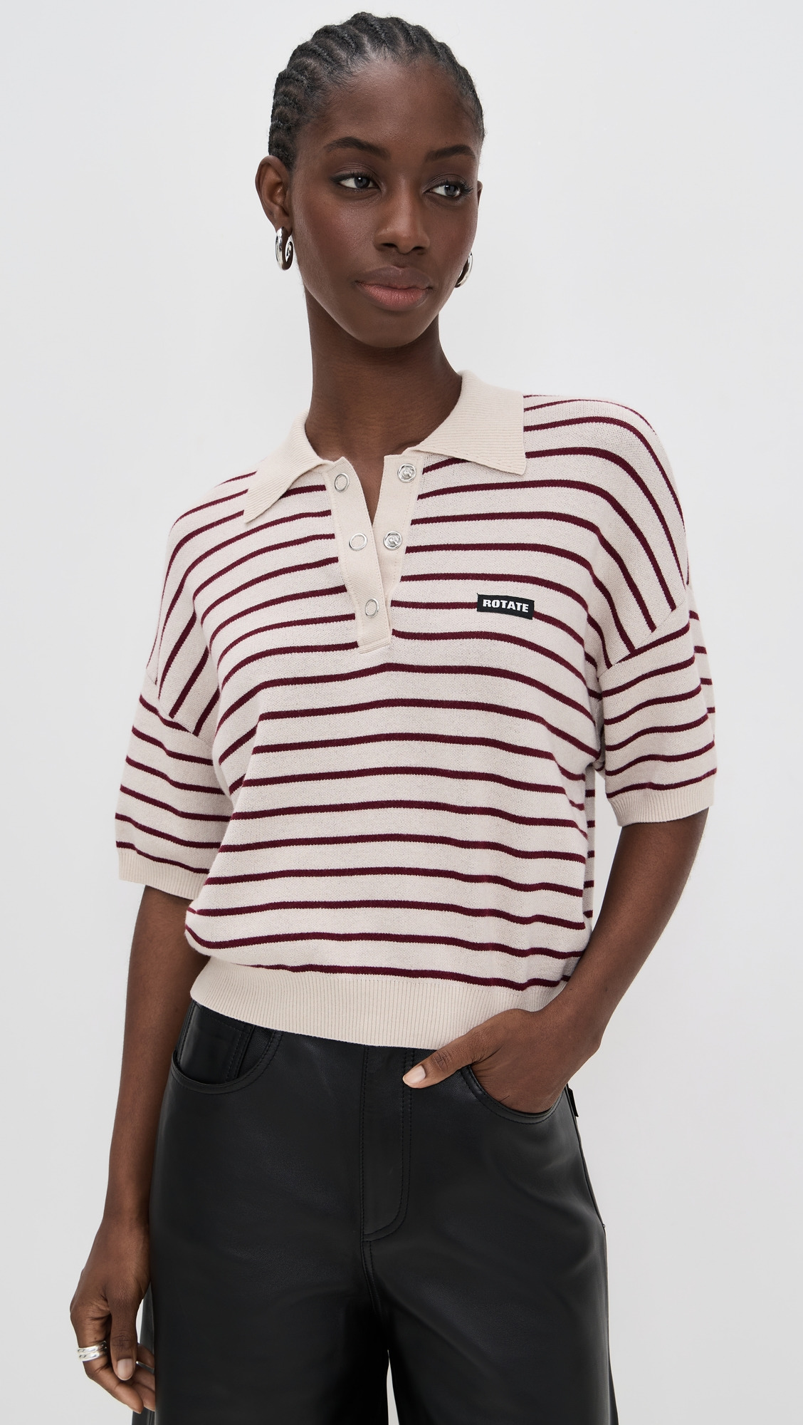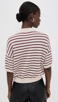 - Fabric: Lightweight, interlock jersey with stretch - Stripe pattern - Dropped shoulders - Logo patch at breast - Ribbed trim - Polo neckline - Short sleeves - Partial snap placket - Shell: 48% modal/32% wool/20% polyamide - Hand wash - Imported, China Style #ROTAT30119 Size & Fit Customers say: Runs large; please size down. Model measurements: Size XS: Cher (5'11") usually wears size XS Measurements from size XS Length: 19.75in / 50.0cm, from shoulder