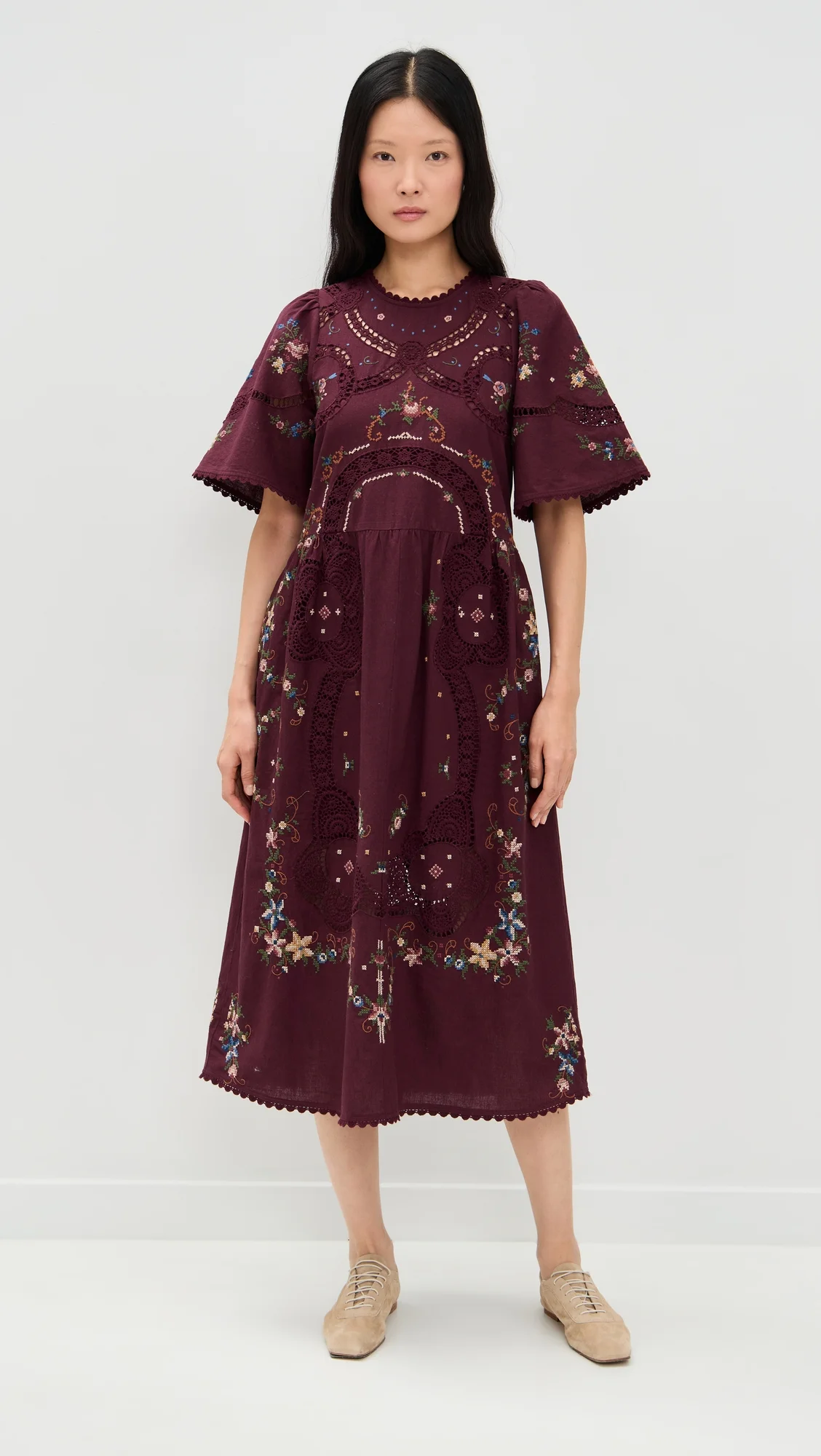 - Fabric: Mid-weight, low-stretch weave - Embroidered accents and crocheted lace details - Midi length - Crew neck - Short flutter sleeves - Tie keyhole at neckline - On-seam side pockets - Shell: 89% cotton/11% flex - Lined - Lining: 100% cotton - Dry clean - Imported, India Style #SEAAA22542