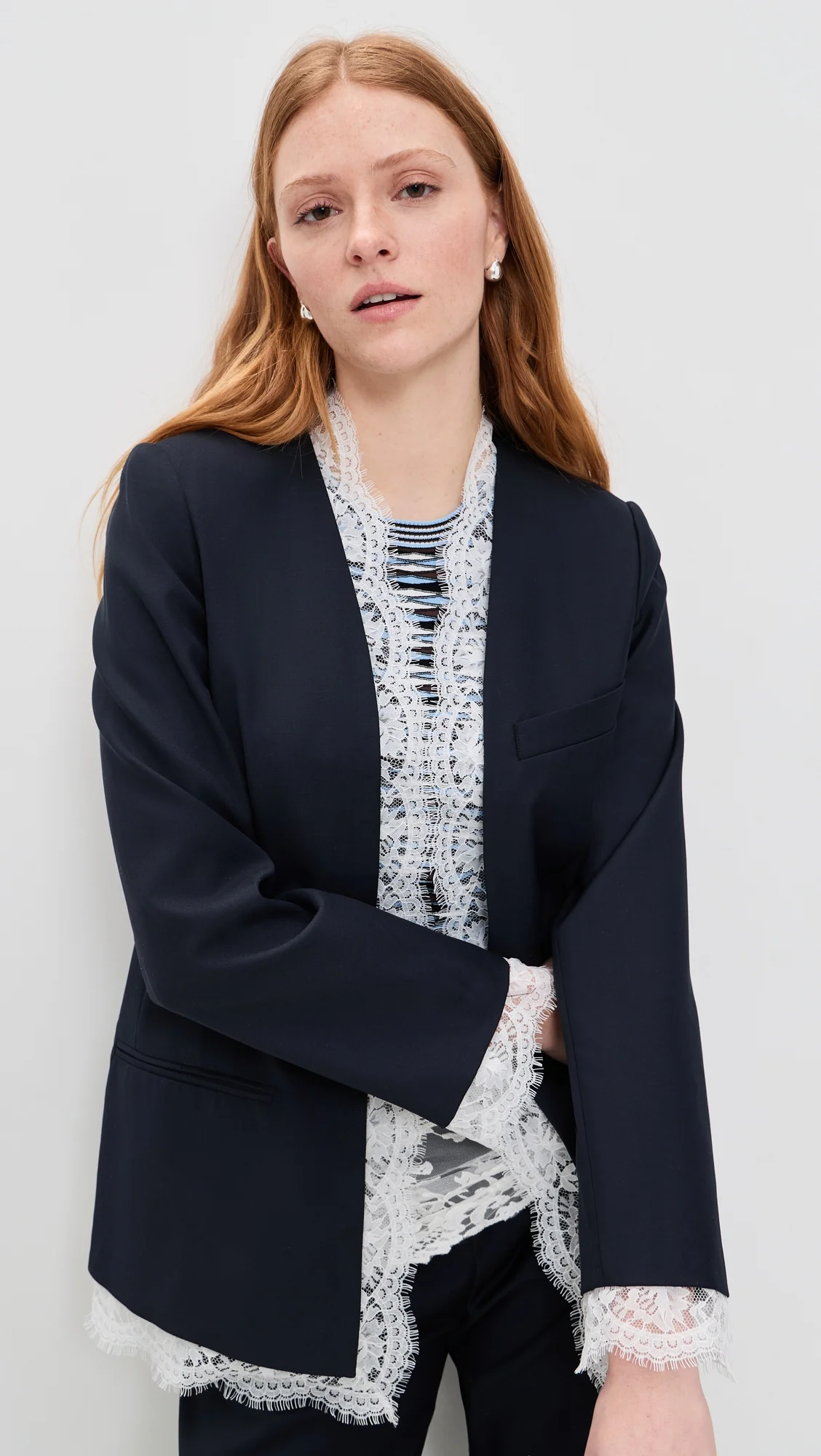 - Fabric: Mid-weight, non-stretch suiting - Lace underlay - Padded shoulders - Collared neck - Long sleeves - Open placket - Faux welt front pockets - Shell: 70% wool/30% polyester - Trim: 100% polyamide - Lined - Lining: 52% polyester/48% viscose - Dry clean - Imported, China Style #SEAAA22622 Size & Fit Model measurements: Size S: Haley (5'9.5") usually wears size S Measurements from size S Length: 27.5in / 70.0cm, from shoulder