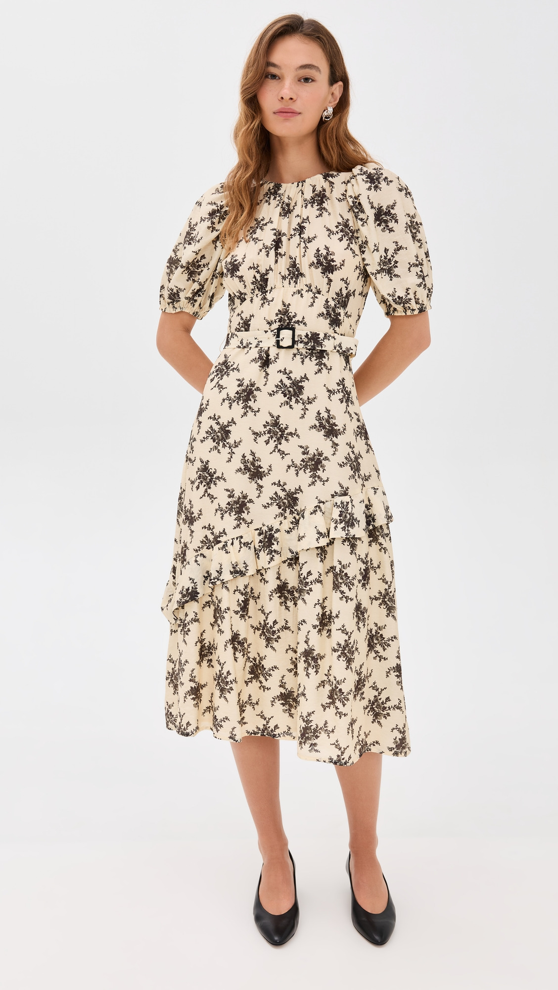 - Fabric: Lightweight, non-stretch weave - Floral print - Curved and gathered bodice - Asymmetrical ruffle and tiered skirt - Midi length - Crew neck - Short puff sleeves with elastic cuffs - Hook-and-eye and hidden zip at back - Self-belt at waist - Shell: 80% viscose/20% nylon - Unlined bodice, lined skirt - Lining: 100% cotton - Wash cold - Imported, India Style #SEAAA22472