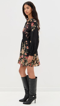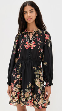 - Fabric: Lightweight, non-stretch satin - Floral print - Ruffled trim and hem - Gold-tone floral aglets - Covered elastic waistband and cuffs - Mini length - Split neckline - Long puff sleeves - Partial button placket with tie keyhole at neckline - On-seam side pockets - Shell: 65% viscose/35% silk - Unlined bodice, lined skirt - Lining: 100% viscose - Dry clean - Imported, China Style #SEAAA22476