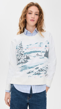 - Fabric: Mid-weight stretch jersey - Distressed trim - Snow scene graphic at front - Crew neck - Long sleeves - Shell: 100% cotton - Trim: 95% cotton/5% spandex - Dry clean - Imported, China Style #SEAAA22599 Size & Fit Model measurements: Size S: Sophie (5'9") usually wears size S Measurements from size S Length: 22in / 56.0cm, from shoulder