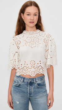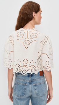 - Fabric: Lightweight, non-stretch linen weave - Embroidered eyelet detailing - Crew neck - Short sleeves - Button keyhole at back - Shell: 55% viscose/45% linen - Dry clean - Imported, India Style #SEAAA22403