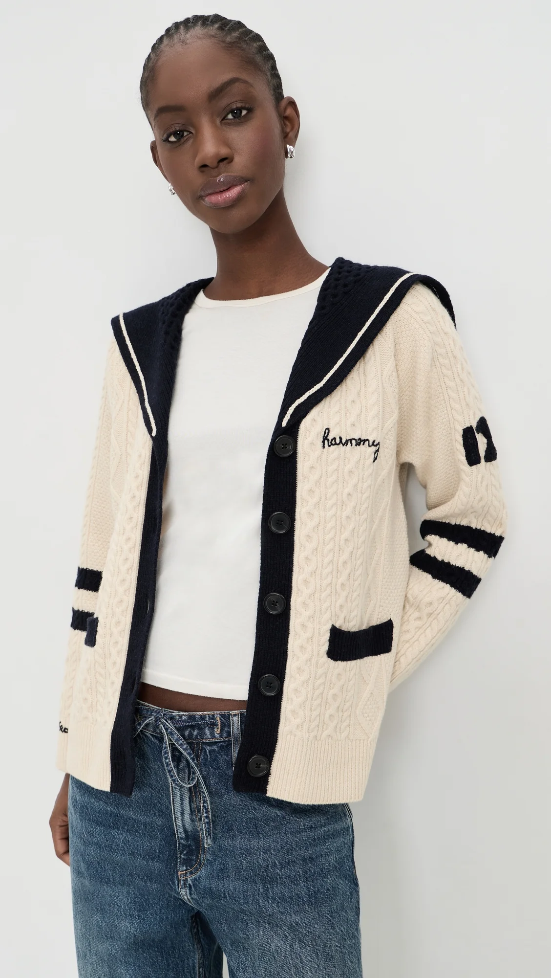 - Fabric: Mid-weight cable knit with stretch - Embroidered lettering at breast - Sailor-style collar - Stripe detailing - Collared neck - Long raglan sleeves - Button placket - Welt front pockets - Shell: 100% wool - Dry clean - Imported, China Style #SEAAA22633 Size & Fit Model measurements: Size XS: Cher (5'11") usually wears size XS Measurements from size XS Length: 24.5in / 62.0cm, from shoulder