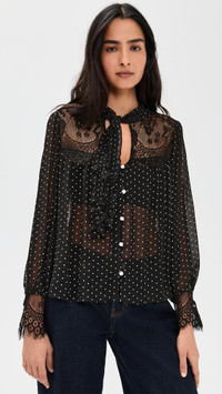 - Fabric: Lightweight, low-stretch chiffon - Tie detail at neck - Lace accents at neck and sleeves - Ruffled collar - Collared neck - Long sleeves with button cuffs - Button placket - Semi-sheer - Shell: 100% viscose - Trim: 100% nylon - Unlined - Dry clean - Imported, India Style #SEAAA22543 Size & Fit Model measurements: Size XS: Priyanka (5'9") usually wears size XS Measurements from size XS Length: 22in / 56.0cm, from shoulder