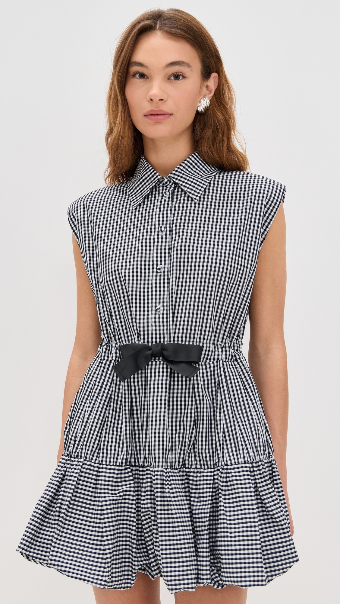 - Fabric: Lightweight, non-stretch weave - Padded shoulders - Gingham check - Bubble hem - Mini length - Collared neck - Short cap sleeves - Drawstring waist and partial button packet - On-seam side pockets - Shell: 100% cotton - Lined - Lining: 100% cotton - Dry clean - Imported, China Style #SEAAA22404